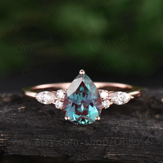 Color change Alexandrite ring for women vintage Alexandrite engagement ring rose gold pear Alexandrite jewelry June birthstone ring gift
