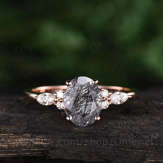 Oval black rutilated quartz engagement ring solid rose gold marquise moissanite ring for women art deco unique ring bridal anniversary gift