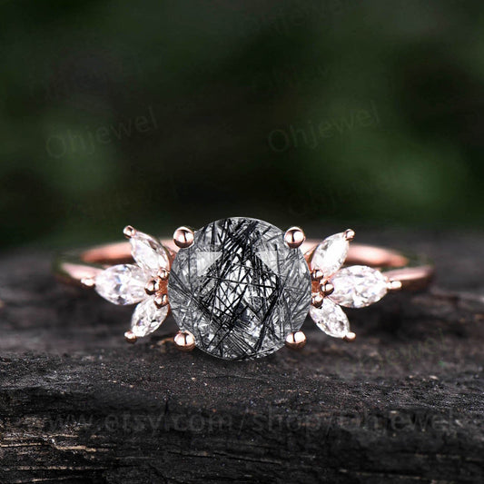Pear black rutilated quartz engagement ring for women vintage marquise moissanite ring rose gold black stone ring anniversary wedding ring