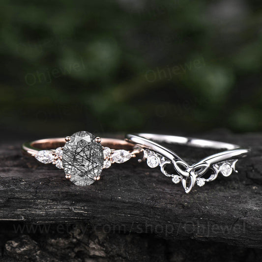 Vintage oval black rutilated quartz engagement ring set moissanite rose gold silver bridal ring women marquise Norse Viking ring jewelry
