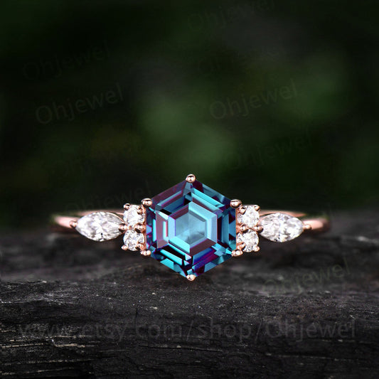 Hexagon Alexandrite engagement ring art deco rose gold silver ring 7 stone vintage moissanite ring for women promise anniversary ring gift