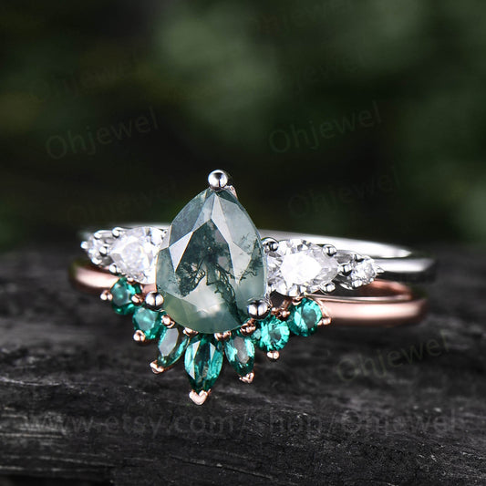Pear shaped moss agate engagement ring set vintage moss agate ring set marquise moissanite ring set green moss ring 7 stone ring bridal set