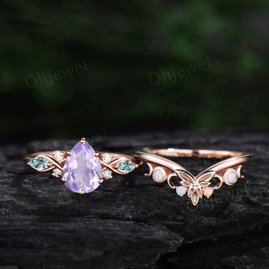 Pear shaped Lavender Amethyst ring vintage unique engagement ring art deco rose gold leaf moon opal ring women twisted promise ring set gift