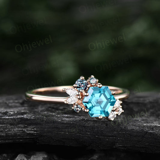 Hexagon cut Paraiba engagement ring 6 prong rose gold cluster Alexandrite diamond wedding anniversary ring women gift