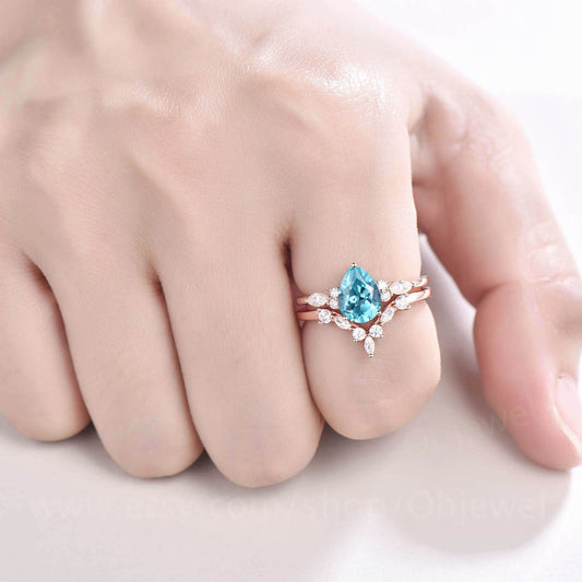 Vintage pear shaped Paraiba engagement ring set rose gold stacking marquise diamond wedding bridal ring set women jewelry