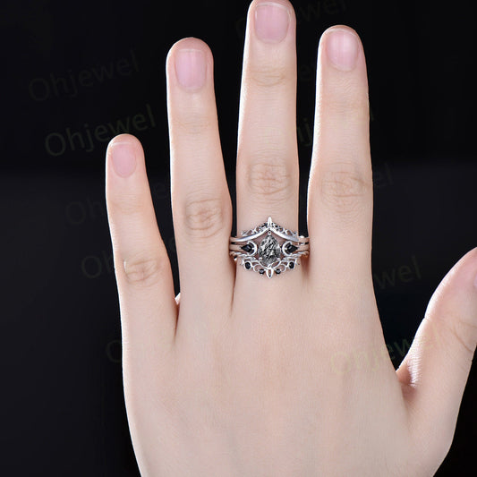Vintage pear black rutilated quartz engagement ring white gold art deco moon ring set black stone unique anniversary promise ring women her