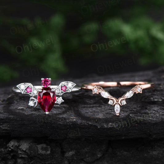 Vintage pear shaped red ruby engagement ring white gold wing moon star bat diamond ring women unique wedding anniversary ring gift