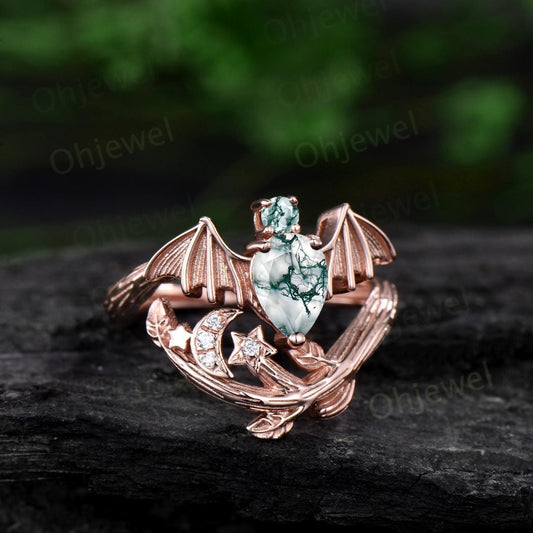 Pear cut moss agate ring vintage rose gold moon bat engagement ring 14k rose gold retro leaf star diamond wedding ring women jewelry