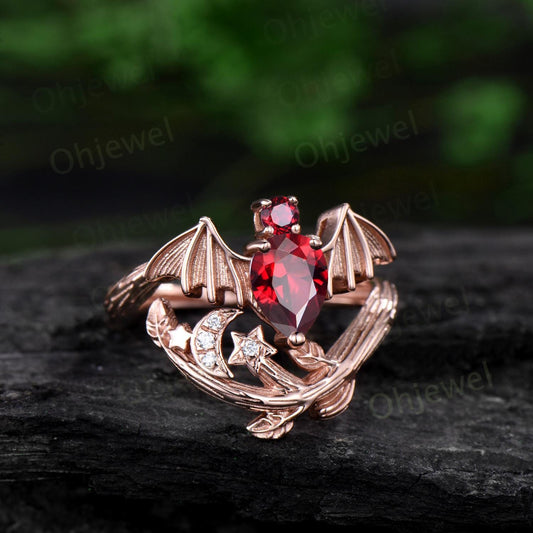 Pear cut ruby ring vintage rose gold moon bat engagement ring 14k rose gold retro leaf star diamond wedding ring women jewelry
