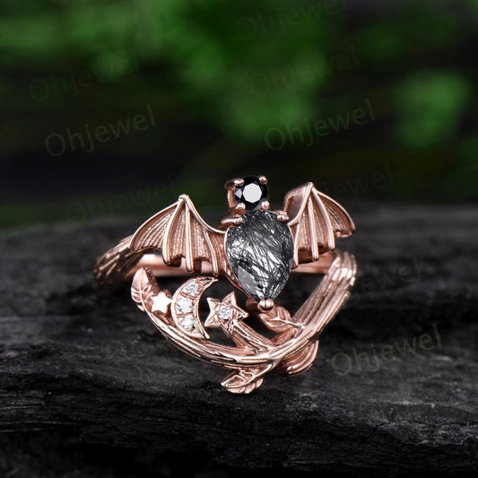 Pear black rutilated quartz ring vintage rose gold moon bat engagement ring 14k rose gold retro leaf star diamond wedding ring women jewelry