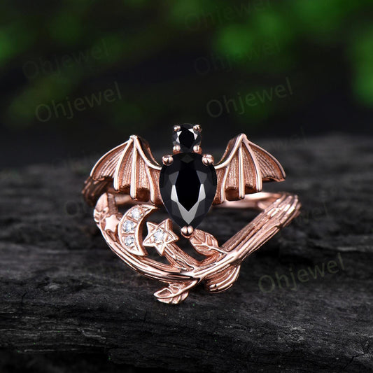 Pear shaped black onyx ring vintage rose gold moon bat engagement ring 14k rose gold retro leaf star diamond wedding ring women jewelry
