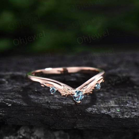 Vintage style three stone Alexandrite wedding band 14k rose gold silver bat curved stacking V shaped anniversary wedding ring band for women