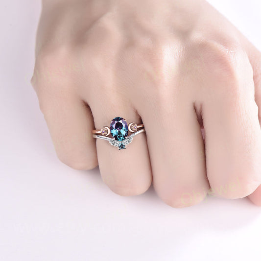 Oval cut Alexandrite ring vintage moon star unique engagement ring rose gold three stone bat wing amethyst ring wedding ring set women gift
