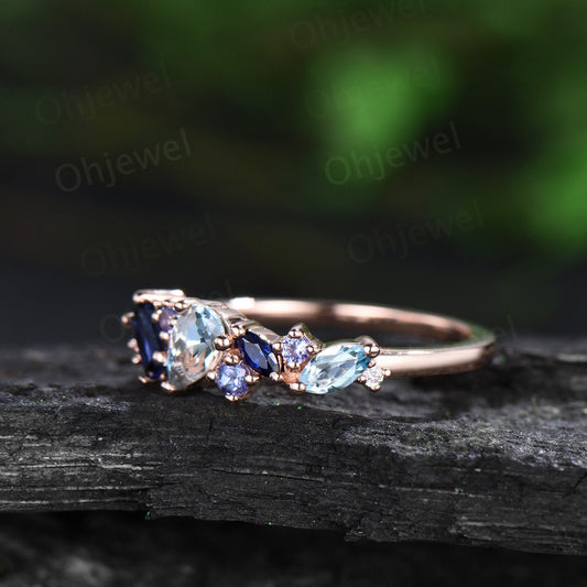 Unique hexagon cut aquamarine ring cluster engagement ring 14k rose gold women gift peridot amethyst ring March birthstone ring fine jewelry
