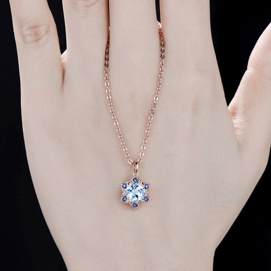 Round natural aquamarine necklace vintage milgrain floral sapphire Pendant women solid 14k rose gold March birthstone anniversary gift her