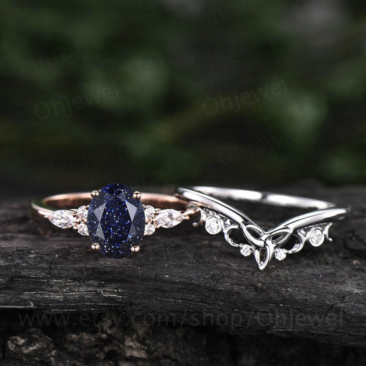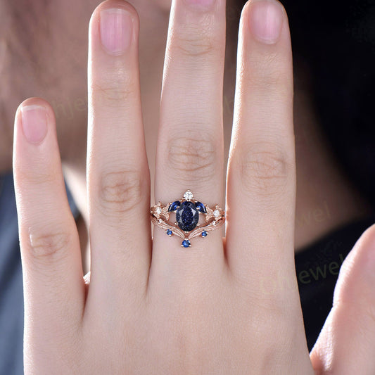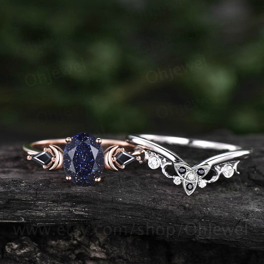 Vintage oval blue sandstone goldstone engagement ring 14k rose gold kite black spinel ring moon moissanite wedding ring set women gift