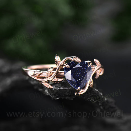 Heart shaped blue sandstone engagement ring leaf flower 14k rose gold silver unique vintage solitaire engagement ring wedding ring for women