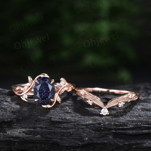 Oval cut blue sandstone ring twig leaf engagement ring set branch nature inspired rose gold ring vintage diamond bridal ring set for women