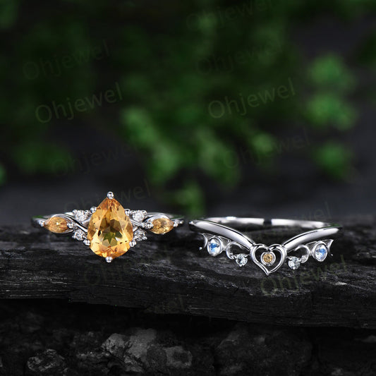 Vintage pear cut yellow citrine engagement ring white gold 6 prong twisted bridal set women moonstone aquamarine wedding band gemstone gift