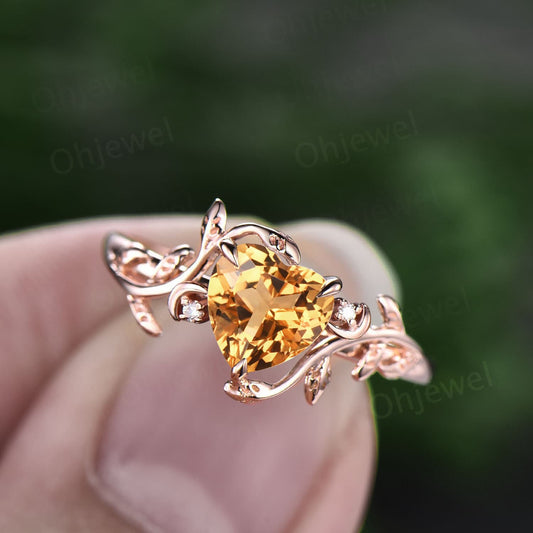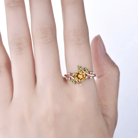 Vintage Hexagon citrine engagement ring nature inspired peridot ring women twig leaf moissanite ring yellow gold branch wedding ring gift