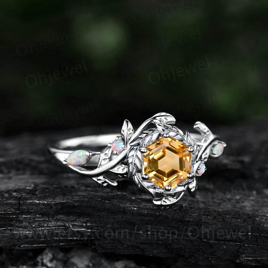 Hexagon cut yellow citrine engagement ring halo leaf 14k white gold opal ring women twig branch anniversary gift crystal ring jewelry gift
