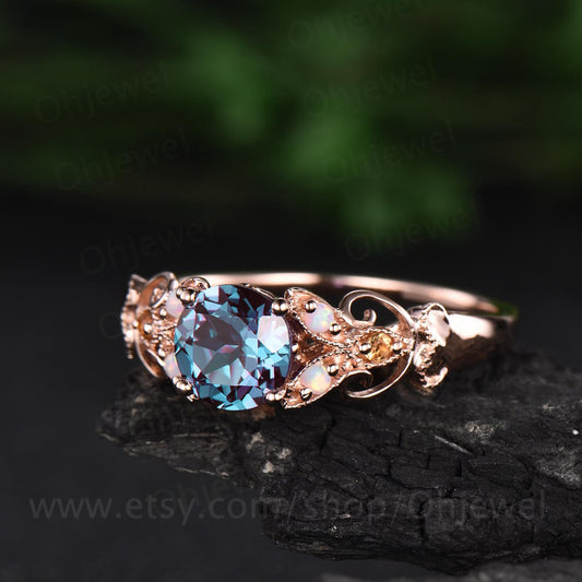 Vintage opal ring citrine ring 1ct round color change alexandrite engagement ring rose gold unique butterfly ring anniversary gift