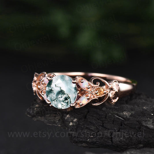 Unique round green moss agate engagement ring art deco vintage opal ring citrine ring milgrain butterfly ring rose gold silver wedding ring