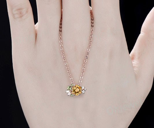 Hexagon cut citrine peridot necklace Pendant vintage 6 prong cluster diamond solid 14k rose gold unique necklace women November birthstone