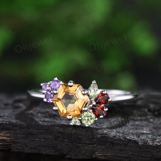 Unique hexagon cut yellow citrine engagement ring cluster peridot amethyst garnet ring women gemstone crystal multi stone ring gift for her