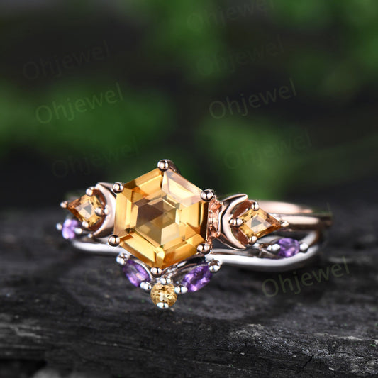Hexagon cut yellow citrine ring vintage moon three stone unique engagement ring women marquise amethyst bridal anniversary ring set gift