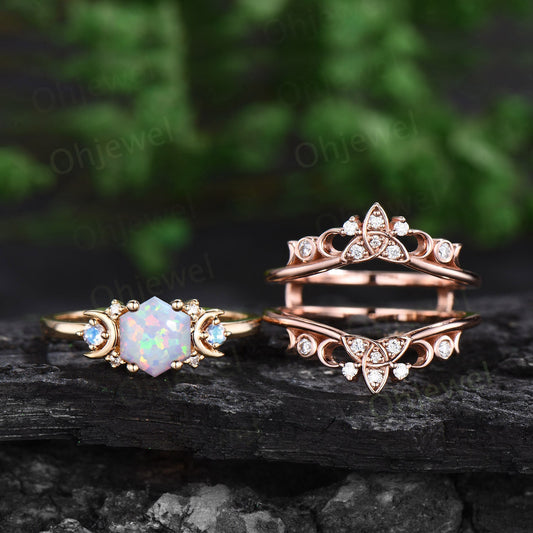 Hexagon white opal engagement ring yellow gold moonstone ring women moissanite Celtic knot moon wedding band enhancer anniversary gift