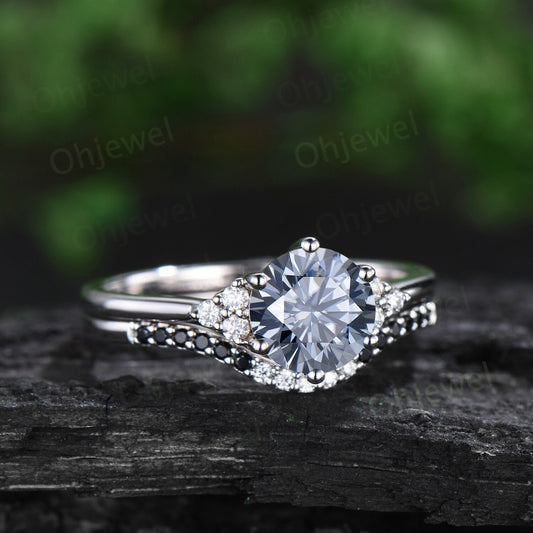 Dainty round cut gray moissanite engagement ring solid 14k white gold 6 prong black diamond ring women stacking wedding bridal ring set