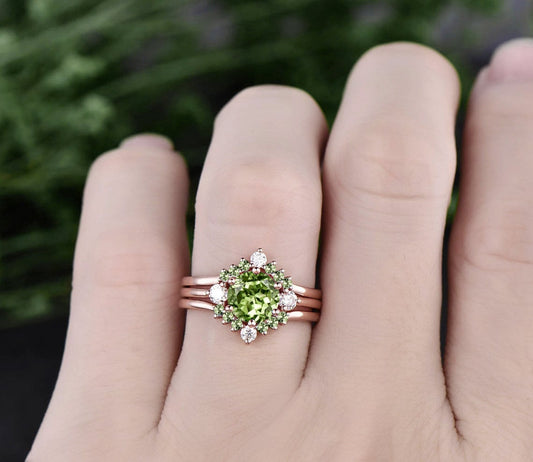 Round cut peridot ring three stone peridot engagement ring set solid 14k rose gold Minimalist moissanite ring for women wedding bridal set