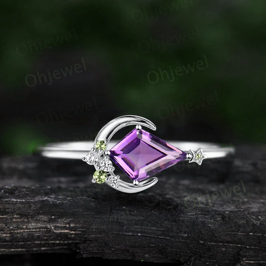 Kite cut purple amethyst ring vintage cluster peridot ring yellow gold east to west moon star engagement ring unique wedding ring for women