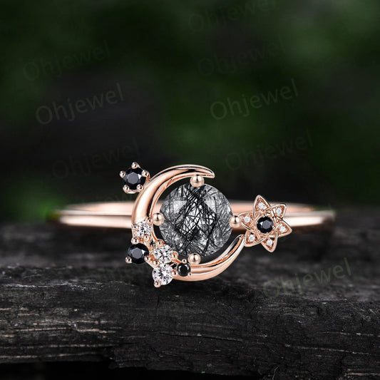 Vintage round black rutilated quartz engagement ring 14k yellow gold star moon cluster moissanite ring black stone ring anniversary gift
