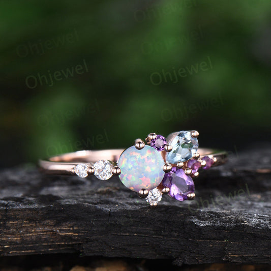 Round opal ring Personalized cluster amethyst ring vintage pear aquamarine ring dainty multi stone ring unique engagement ring women gift