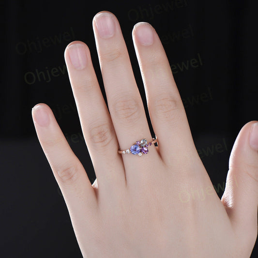 Round Tanzanite ring Personalized cluster amethyst ring vintage pear aquamarine ring dainty multi stone ring unique engagement ring women