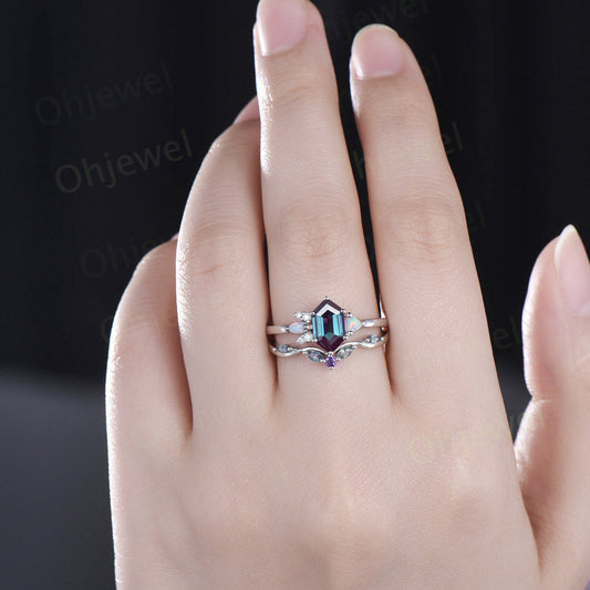 Vintage Long hexagon alexandrite engagement ring opal amethyst ring 14k white gold cluster moissanite anniversary wedding bridal set women