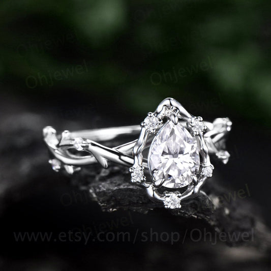 Pear moissanite ring vintage halo leaf branch nature inspired unique engagement ring 14k white gold Twisted diamond anniversary ring women
