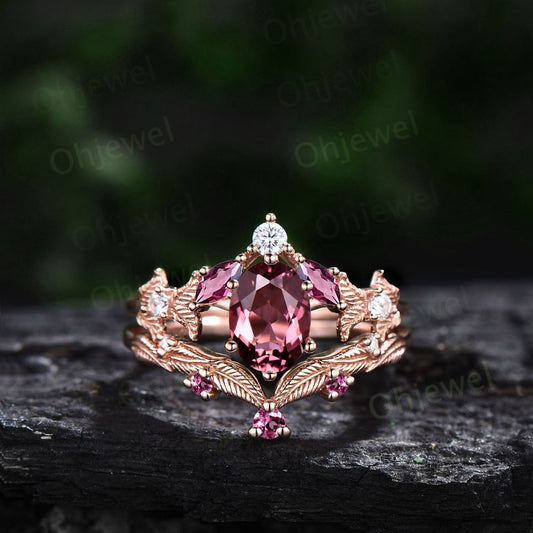 Twig oval cut Pink Tourmaline engagement ring set 14k rose gold branch leaf diamond ring art deco unique promise wedding ring set for women