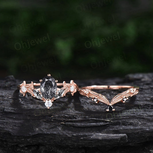 Twig oval cut black rutilated quartz engagement ring set rose gold branch leaf diamond ring art deco unique promise wedding ring set women