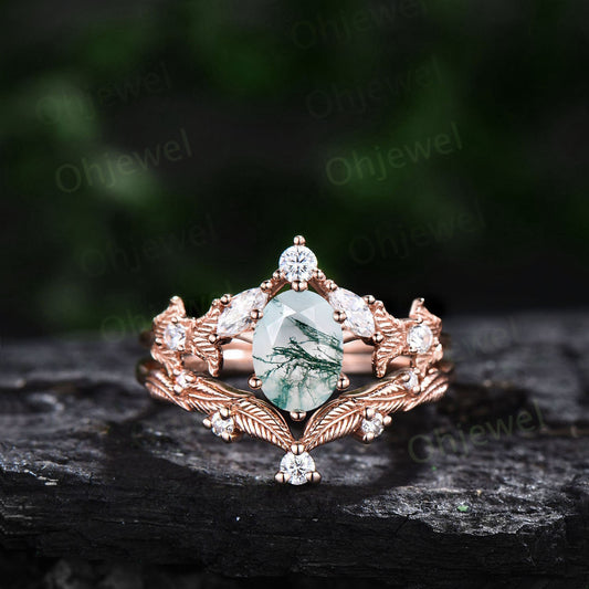 Twig oval cut green moss agate engagement ring set rose gold branch leaf diamond ring art deco unique promise wedding ring set for women