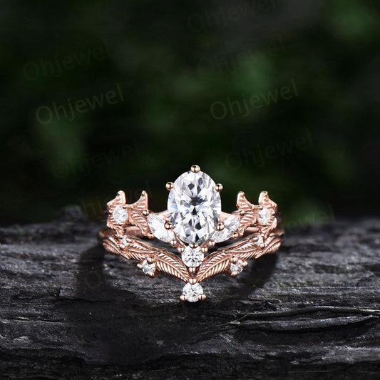 Unique oval moissanite engagement ring set rose gold Twig branch leaf nature inspired engagement ring diamond bridal wedding ring set women