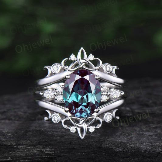 4ct oval cut Alexandrite engagement ring set solid 14k white gold art deco diamond ring vintage moon Celtic knot wedding ring set for women