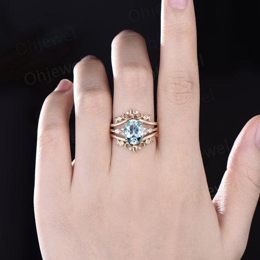 8x10mm oval cut Aquamarine engagement ring set solid 14k white gold art deco diamond ring vintage moon Celtic knot wedding ring set women