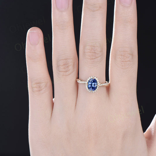 Oval natural Tanzanite ring vintage unique engagement ring halo twisted diamond ring prong set fine jewelry yellow gold bridal ring women