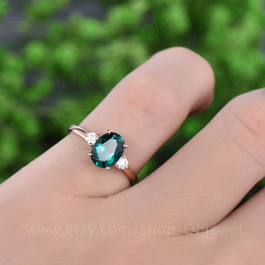 Three stone moissanite ring oval cut emerald engagement ring rose gold emerald ring vintage May birthstone women wedding bridal ring gift