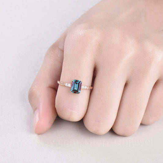 Vintage emerald cut Alexandrite engagement ring Alexandrite ring rose gold for women five stone unique ring Alexandrite jewelry bridal ring