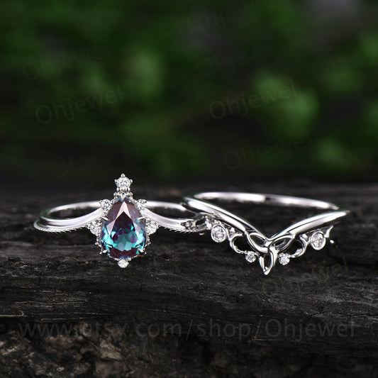 Unique wedding ring set Pear alexandrite engagement ring set white gold vintage moissanite ring set bridal ring set color change stone ring