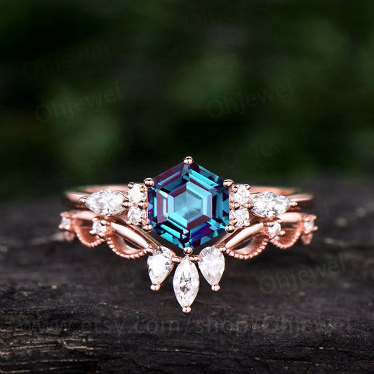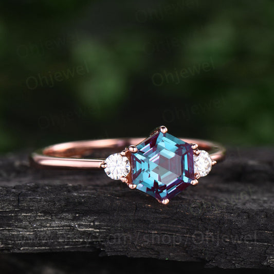Hexagon Alexandrite ring for women vintage Alexandrite engagement ring rose gold silver three stone ring moissanite anniversary ring set